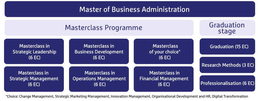 How do you translate your organisation’s strategic vision into daily operations? How to achieve growth? And how do you develop agile leadership in a changing work context? The above focal points of the MBA programme comprise 60 ECTS (European Credit Transfer and Accumulation System).