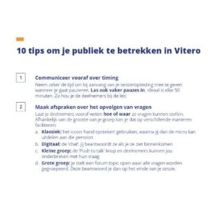 Wil je snel weg zijn met de voornaamste knoppen en instellingen in Vitero? Schrijf je dan in voor deze korte sessie via deze link: "Quick Start to Vitero (45’)". Let op, we tonen jou hier enkel de basishandelingen in Vitero. De uitgebreide tools om met je publiek in interactie te gaan komen slechts gedeeltelijk aan bod. Deze training wordt gratis aangeboden.
