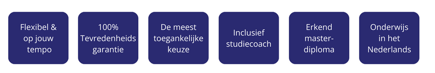 Anders dan bij veel opleidingsinstituten heeft de MBA van NCOI Business School een heldere structuur, waarbij je een reeks masterclasses van telkens 3 maanden volgt. Je sluit elke masterclass af met een vast evaluatiemoment. De volgorde van de masterclasses is vrij te kiezen.