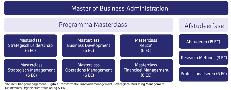 De MBA bestaat uit verschillende masterclasses. Elke masterclass is gespreid over 3 maanden. Je hebt tweewekelijks les bij volle lesdagen en wekelijks bij halve lesdagen. De overige leeractiviteiten bestaan uit zelfstudie, kennistoepassing en leeropdrachten op het online leerplatform of op je eigen werkplek. De volledige studiebelasting is gemiddeld 15 à 17 uur per week.